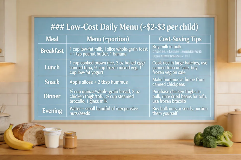 Low‑Cost Daily Menu (≈$2‑$3 per child)