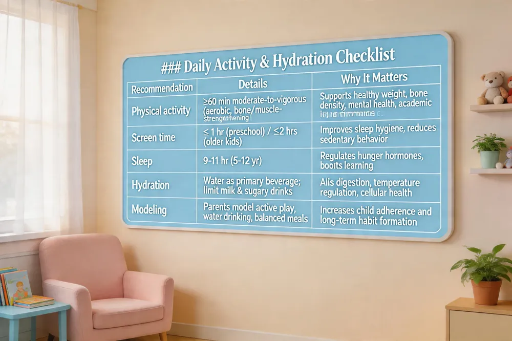 Children need at least 60 minutes of moderate‑to‑vigorous physical activity each day, including aerobic, bone‑strengthening, and muscle‑strengthening activities. Pairing this movement with sensible Reducing screen time improves sleep quality, helps maintain a healthy weight, boosts academic performance, and supports better mental health. (no more than 1 hour for preschoolers and a maximum of 2 hours for older kids) helps improve sleep hygiene; adequate sleep in turn regulates hunger hormones and boosts academic performance. Water should be the primary beverage; excess milk or sugary drinks add unnecessary calories.—replace sugary drinks and excessive fruit‑juice servings with plain water, which aids digestion, temperature regulation, and overall cellular health. Parents and caregivers should model these habits, involve kids in planning active outings, and consult pediatric health‑care providers if activity levels, sleep patterns, or hydration habits raise concerns about growth or chronic‑disease risk.