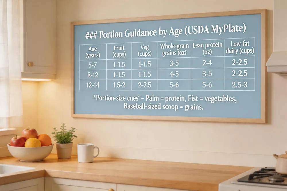 Parents can translate these ratios into easy portion cues—use a child’s palm for protein, a fist for vegetables, and a baseball‑sized scoop for grains—to keep servings age‑appropriate without counting every ounce.