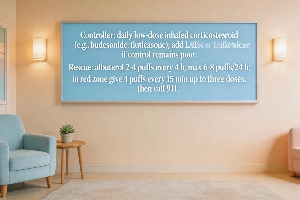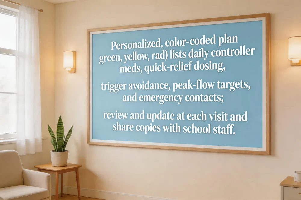 An Asthma Action Plan is a written guide that translates medication schedules, symptom zones (green, yellow, red), and emergency steps into a roadmap for children and teens. Key takeaways: use controller inhalers, recognize warning signs, follow traffic‑light zone actions, and keep a rescue inhaler handy at home and school. Next steps for families: work with the child’s healthcare provider to complete plan, give copies to teachers, daycare staff, and coaches, practice inhaler technique with a spacer, and review plan yearly or after changes. Providers should confirm trigger lists, check inhaler technique, update medication doses, and reinforce education at visits.