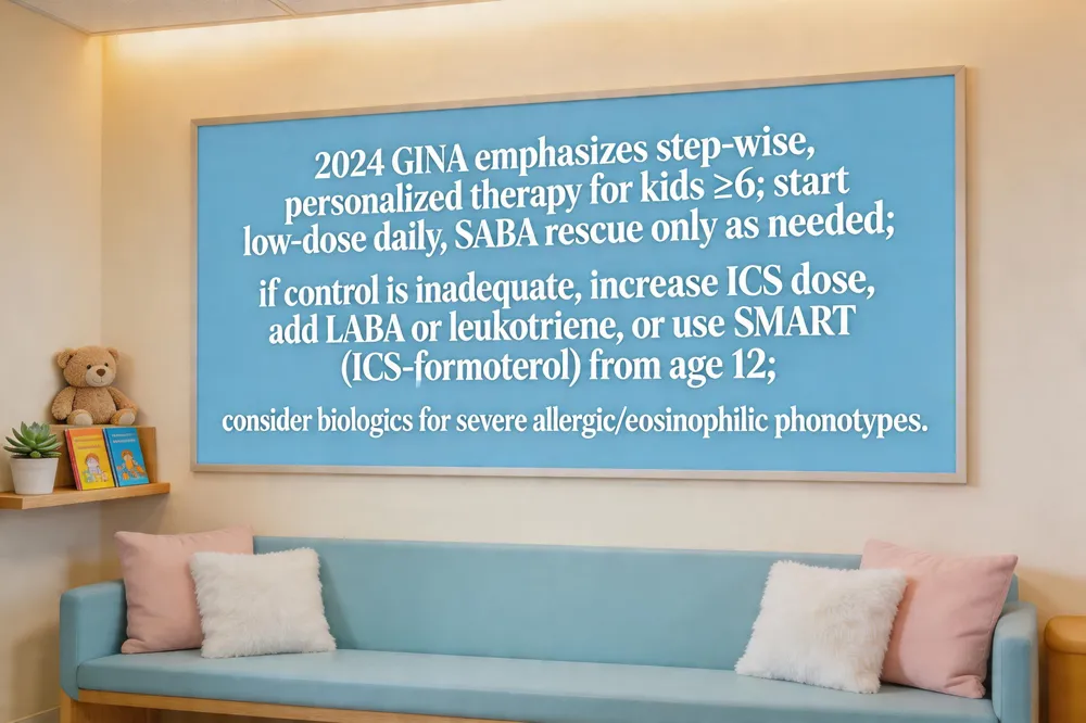 The 2024 Global Initiative for Asthma (GINA) update reinforces a step‑wise, personalized strategy for kids ≥ 6 years and teens. First, a low‑dose inhaled corticosteroid (ICS) is the preferred daily controller, with a short‑acting β₂‑agonist (SABA) reserved for occasional rescue. If control remains inadequate, clinicians increase the ICS dose (step 2) or add a leukotriene receptor antagonist or a long‑acting β₂‑agonist (LABA) at step 3. More severe disease may require higher‑dose ICS, LABA + ICS combos, a long‑acting muscarinic antagonist, or biologic therapy for allergic/eosinophilic phenotypes.