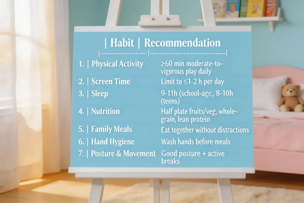 Encourage at least 60 minutes of moderate‑to‑vigorous play daily—games, bike rides, dancing—paired with simple cooking projects that teach fruit, veg, and whole‑grain choices. Keep a consistent sleep routine (9‑11 h for school‑age, 8‑10 h for teens) and offer water or low‑fat milk instead of sugary drinks. Limit screens to 1‑2 h and replace excess time with family meals or active hobbies.
