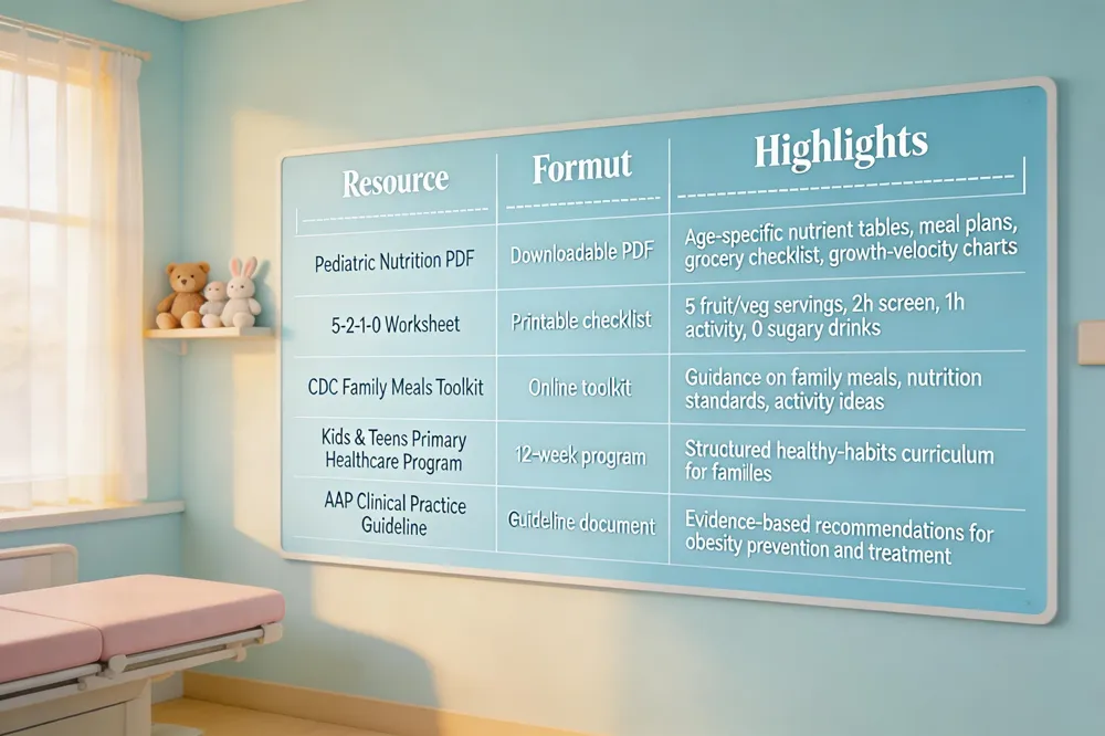 Checklists – Quick‑reference checklists help parents monitor daily fruit‑and‑vegetable servings, screen‑time limits, sleep‑duration goals and physical‑activity minutes (≥60 min for ages 6‑17). A printable “5‑2‑1‑0” worksheet reinforces the CDC’s guideline of five fruit/veg servings, two hours of screen time, one hour of activity and zero sugar‑sweetened beverages.