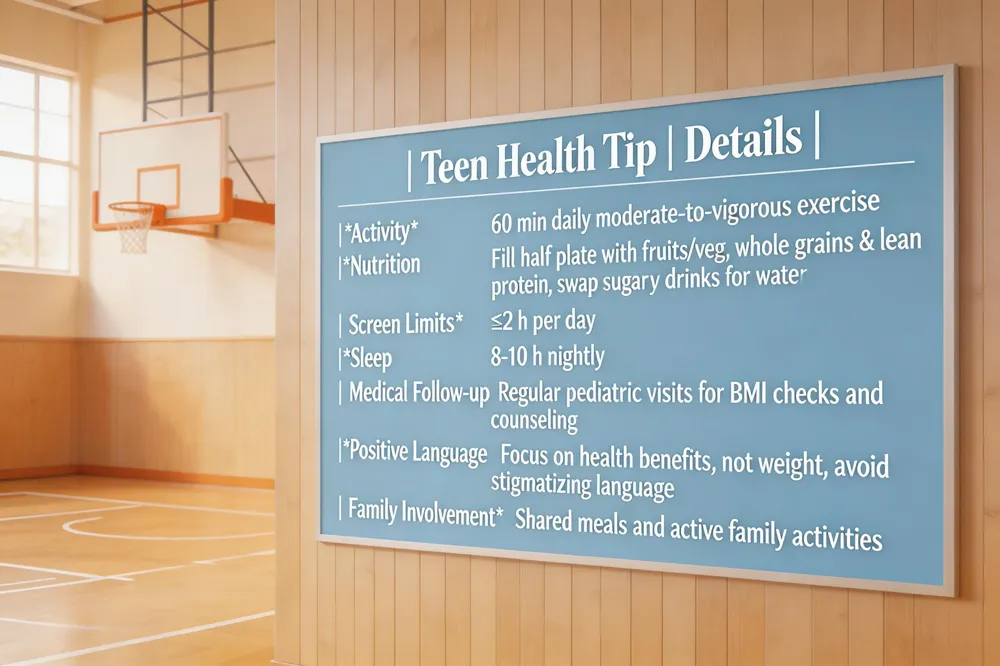 How can teens prevent obesity? Aim for 60 min daily moderate‑to‑vigorous activity, fill half plate with fruits/veg, choose whole grains/lean protein, swap sugary drinks for water, limit screen time, get 8‑10 h sleep, see pediatrician regularly.