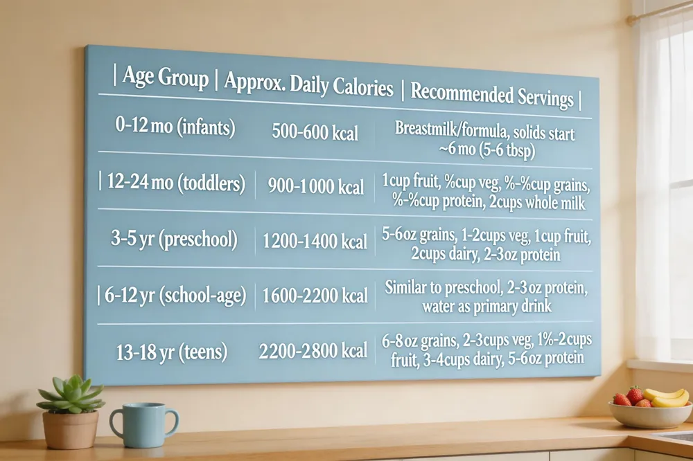 Infants 0‑12 mo: breastmilk/formula; solids start 6 mo, 1‑2 tbsp 5‑6 × day. Toddlers 12‑24 mo: ~1 cup fruit, ¼ cup veg, ¼‑½ cup grains, ¼‑½ cup protein, 2 cups whole‑milk. Preschoolers 3‑5 yr: 5‑6 oz grains, 1‑2 cups veg, 1 cup fruit, 2 cups dairy, 2‑3 oz protein. School‑age 6‑12 yr: similar grain/veg/fruit portions, 2‑3 oz protein, water as primary drink. Teens 13‑18 yr: 6‑8 oz grains, 2‑3 cups veg, 1½‑2 cups fruit, 3‑4 cups dairy, 5‑6 oz protein.