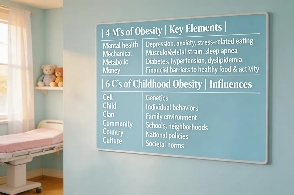 4 M’s of obesity Mental health (depression, anxiety, stress‑related eating), Mechanical (musculoskeletal strain, sleep apnea), Metabolic (diabetes, hypertension, dyslipidemia), and Money (financial barriers to healthy food and activity) together shape a child’s weight trajectory.
