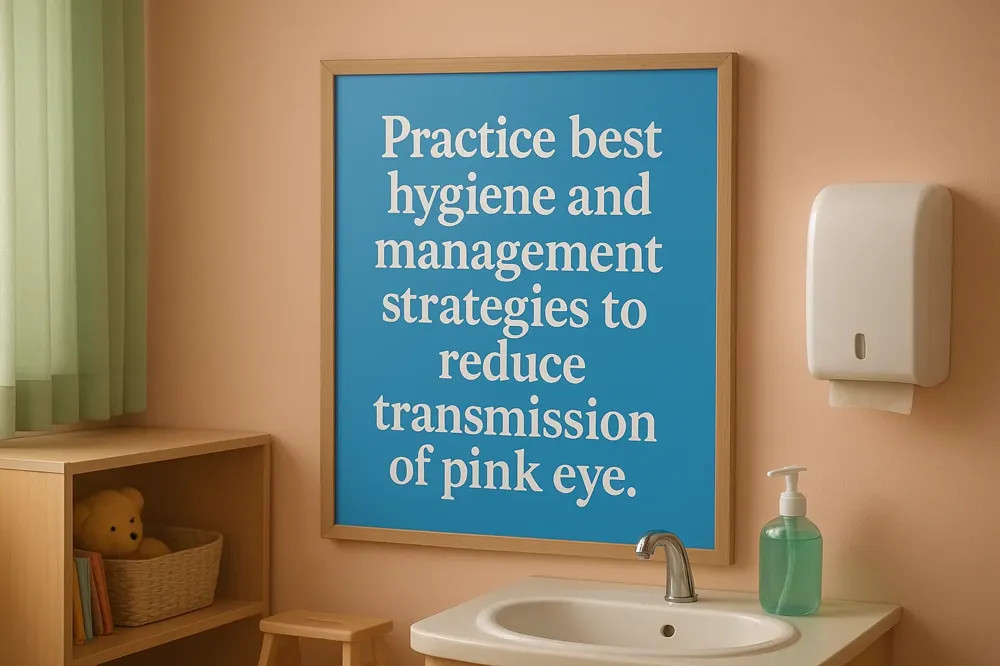 Practicing good hygiene is essential to limit the spread of conjunctivitis, especially among children who frequently touch their eyes. Regular handwashing with soap and water for at least 20 seconds helps eliminate germs. Caregivers should encourage children to avoid rubbing or touching their eyes, which can exacerbate symptoms and increase contagion risk. Additionally, children should be taught not to share towels, washcloths, pillows, or eye makeup, as these items can carry infectious secretions. See more on Hygiene Tips to Prevent Pinkeye.