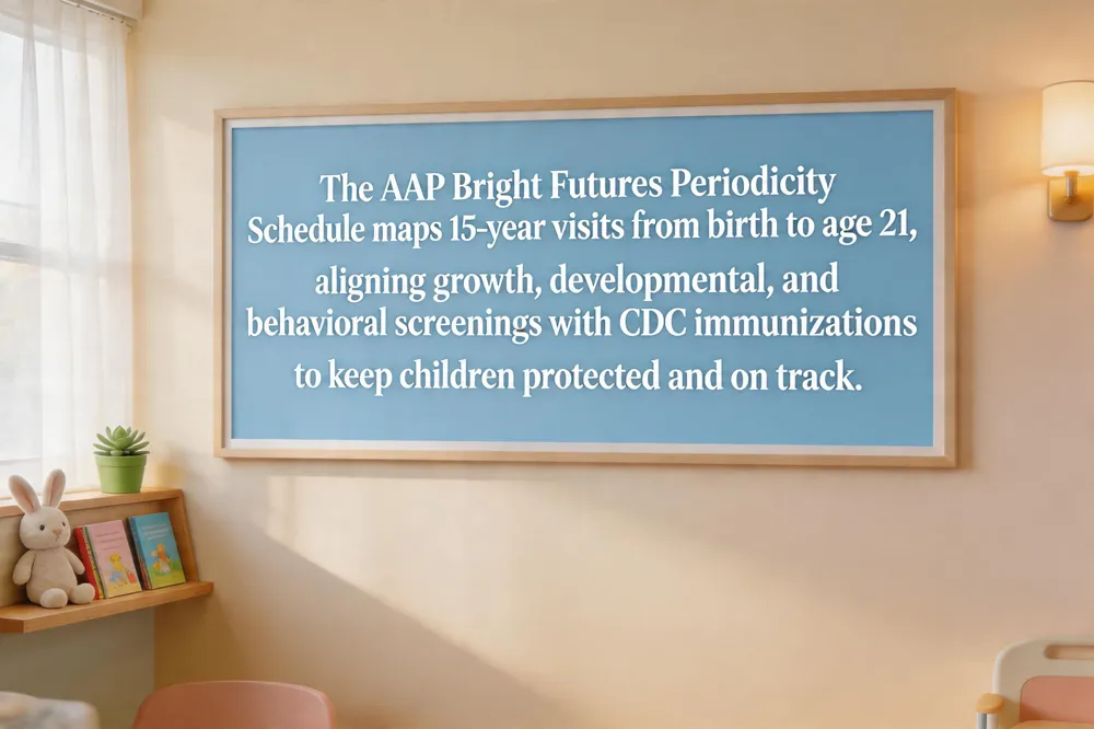 The American Academy of Pediatrics (AAP) Bright Futures Periodicity Schedule is the gold‑standard road‑map for preventive pediatric care from birth through age 21. Its timing mirrors the CDC’s immunization recommendations, so every well‑visit naturally aligns with the next vaccine dose, ensuring children stay up‑to‑date on protection against measles, pertussis, HPV, COVID‑19 and more. Parents can download a clear, age‑by‑age PDF of the schedule at https://downloads.aap.org/AAP/PDF/periodicity_schedule.pdf, which outlines when to expect growth measurements, blood‑pressure checks, developmental and behavioral screenings, and BMI assessments. Key visits include newborn (3‑5 days), 1 month, 2 months, 4 months, 6 months, 9 months, 12 months, 15 months, 18 months, 2 years (24 months), 2½ years (30 months), 3 years, 4 years, 5 years, then annually through age 21. Each appointment offers anticipatory guidance on nutrition, safety and sleep, and a chance for parents to bring 3‑5 questions. Following this schedule helps catch developmental delays, behavioral concerns, and health issues early, laying a solid foundation for a child’s physical, mental and social wellbeing.