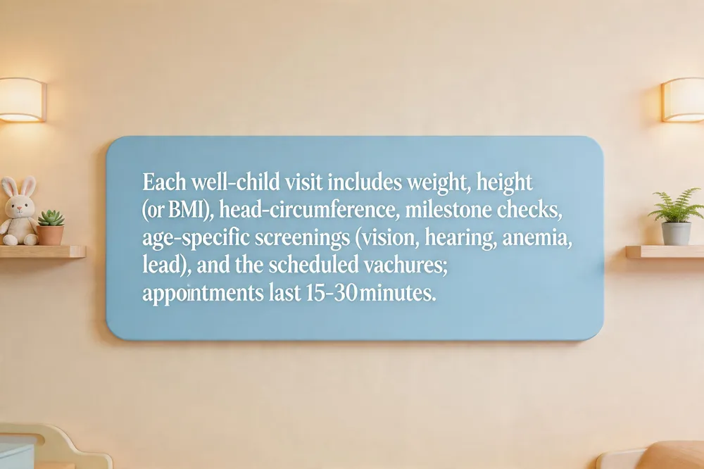 Well‑child visits follow the AAP Bright Futures schedule, starting the a first‑week checkup after birth and then at 1, 2, 4, 6, 9, 12 months. After the infant year the appointments move to 15 months, 18 months, 2 years, 2½ years, 3 years, 4 years, 5 years and continue annually from age 6 through 21. Each visit includes age‑specific measurements—weight, height, head‑circumference or BMI—growth‑chart tracking, developmental milestone checks, and immunizations per the CDC schedule. Vision, hearing, anemia, lead and behavioral screenings are added at recommended ages. The typical appointment lasts 15‑30 minutes: a physical exam, vitals, vaccine administration, and a brief counseling session. Parents are encouraged to arrive early, complete any pre‑visit forms, and bring a short list of 3‑5 questions about nutrition, sleep, safety or behavior. A pediatric preventive visit is a proactive health assessment that catches issues early, reinforces healthy habits, and supports the child’s physical, mental and social development throughout childhood and adolescence.