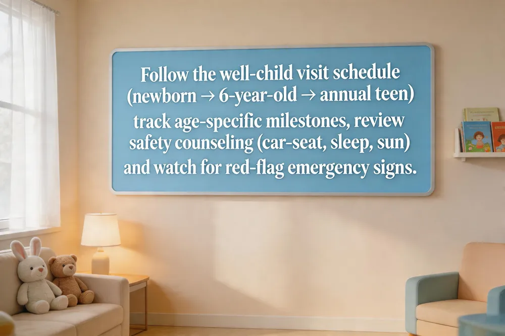 Safety counseling and emergency signs Pediatricians review car‑seat safety, stair guards, safe‑sleep practices, and sun protection. Parents are taught to recognize red‑flag signs such as persistent fever, difficulty breathing, seizures, or sudden change in behavior, and instructed to call the office or emergency services promptly.