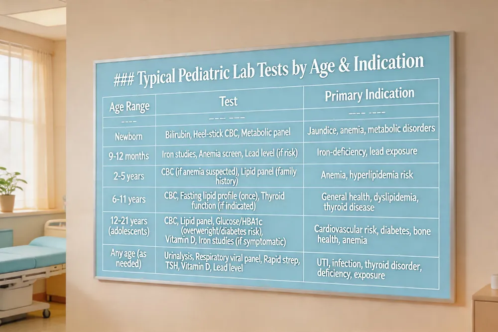 What are the most common pediatric lab tests? What are the most common pediatric lab tests?: 1) Complete Blood Count (CBC) – anemia, infection; 2) Basic Metabolic Panel (BMP) – electrolytes and kidney function; 3) Lipid Profile – cholesterol screening; 4) Urinalysis – UTIs, kidney issues; 5) Thyroid‑Stimulating Hormone (TSH) – thyroid disorders; 6) Iron studies – iron‑deficiency anemia; 7) Lead level – exposure screening; 8) Vitamin D level – deficiency; 9) HbA1c or fasting glucose – diabetes risk; 10) Respiratory viral panel when the child is sick.