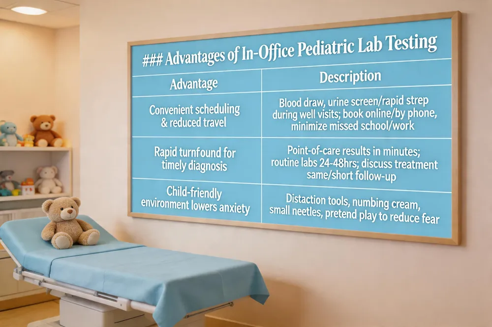 In‑office pediatric laboratory testing brings three big advantages that make health care smoother for families. First, convenient scheduling and reduced travel means that a blood draw, urine screen, or rapid strep test can be done during a regular well‑child visit, eliminating the need for a separate trip to a distant laboratory. Parents can book the appointment online or by phone, often at a time when the child is well‑rested and not hungry, which cuts down on missed school or work days.