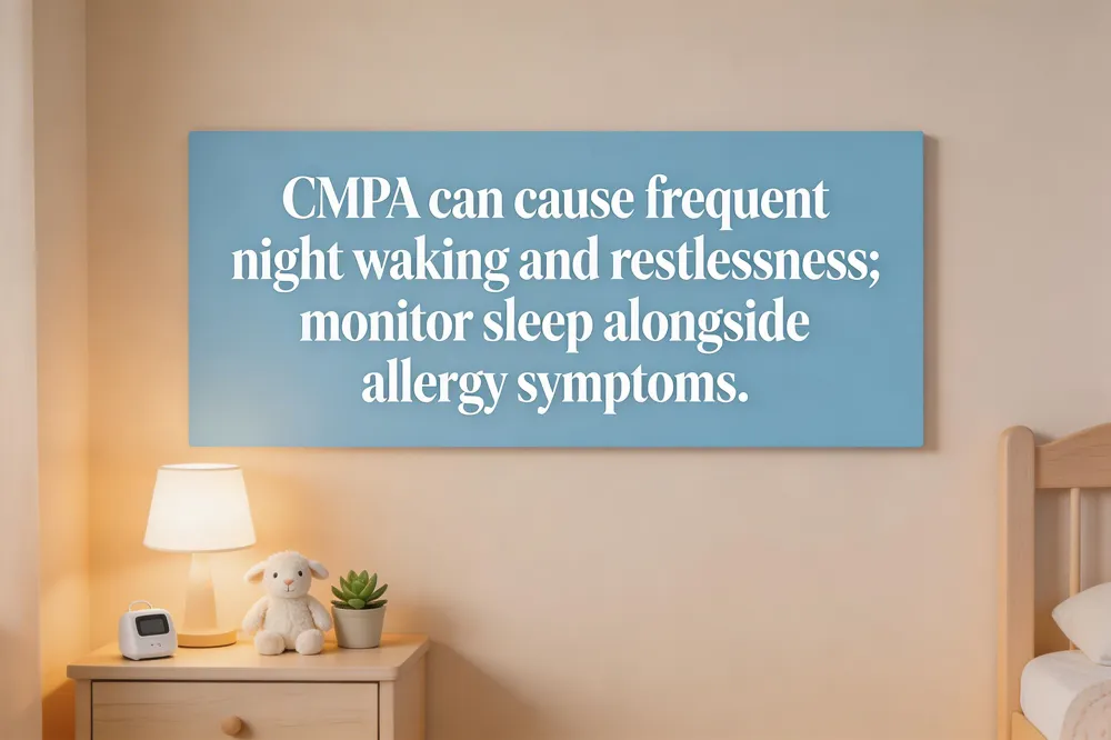 Cow’s Milk Protein Allergy (CMPA) can disturb an infant’s rest. Babies with CMPA often have trouble falling asleep, wake frequently at night, or show restless sleep. These sleep issues usually accompany other signs such as colic, reflux, skin rash, or chronic coughing. Because many factors can cause sleep problems, parents should record sleep patterns together with any allergy‑related symptoms and discuss them with a pediatrician.