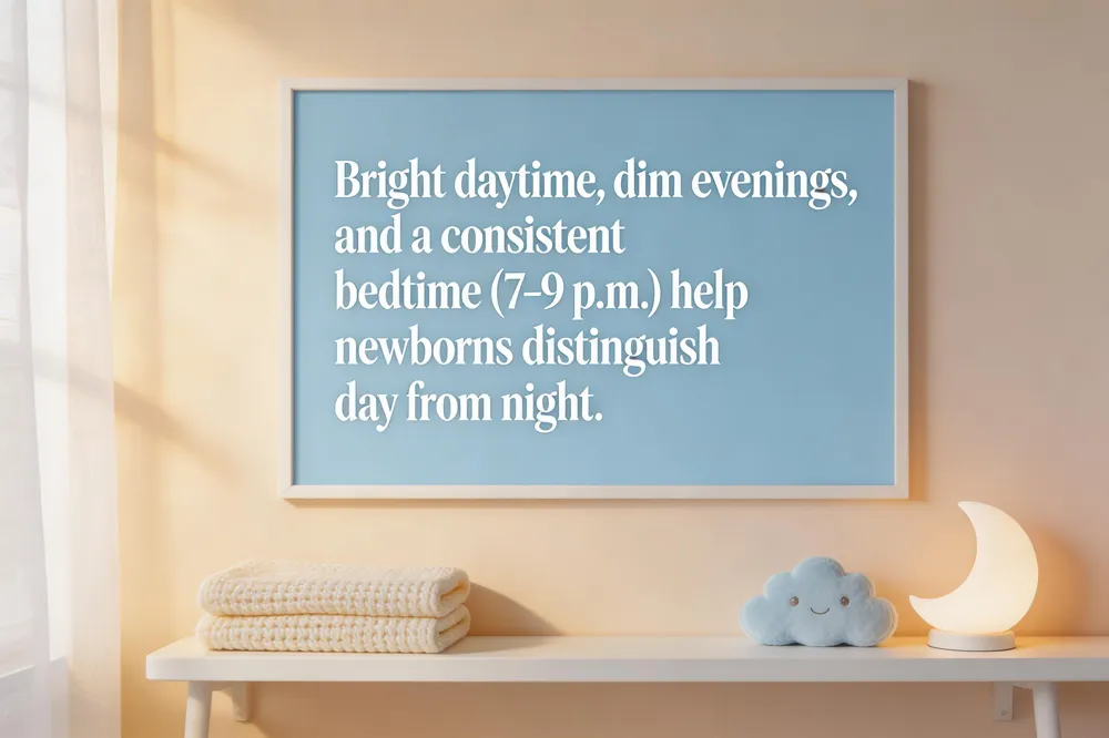 Newborns often mix day and night because their internal clock is still immature; they receive only brief light cues and rely on hunger to drive wake‑ups, leading to frequent, short sleep bouts around the clock. Providing bright, lively environments during daylight and keeping evenings dim and quiet helps the baby learn the difference between day and night. A simple bedtime ritual—soft lullaby, diaper change, gentle rocking—paired with a consistent bedtime (7 p.m.–9 p.m.) signals that sleep is for night. In the first week babies sleep 14‑17 hours in 1‑3‑hour fragments with no clear pattern. By weeks 2‑4 the same fragmented schedule persists, but a modestly longer nighttime stretch often appears. Around 4‑6 weeks a rudimentary circadian rhythm emerges, producing 3‑4‑hour night stretches and longer daytime naps. By weeks 9‑12 the schedule resembles a 24‑hour cycle with 3‑4‑hour night sleep and 2‑3 daytime naps. If a newborn shows extreme fussiness, poor feeding, or abnormal sleep duration, parents should consult their pediatrician promptly, as early medical evaluation can rule out weight‑gain issues or health concerns.