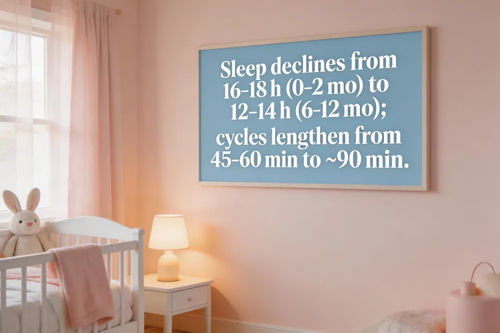 Newborns (0‑3 months) need 16‑17 hours a day, sleeping in 1‑2‑hour bursts and waking often for feeds because their circadian clock is not yet set. By 4‑6 months most babies develop a rhythm, getting 12‑16 hours total with longer night stretches (5‑6 hours) and two‑to‑three naps. At 6‑12 months nighttime sleep consolidates to 10‑12 hours, with two regular naps and fewer awakenings. Toddlers (1‑2 years) require 11‑14 hours, usually a solid 10‑12‑hour night sleep and one daytime nap. REM sleep declines as deep NREM rises, making cycles longer and more adult‑like.