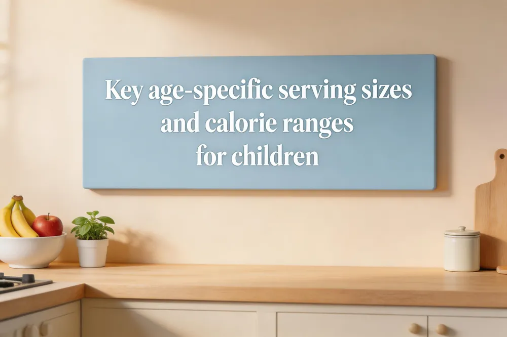 A child nutrition chart shows age‑specific servings: 1‑12‑year‑olds need about 1‑1½ cups fruit, 1‑1½ cups vegetables, 3‑5 oz whole‑grain, 2‑5 oz protein, 2‑2½ cups low‑fat dairy, and roughly 1,000‑1,400 kcal daily. Added sugars, saturated fats, and sodium are limited, steering families toward lean protein, beans, nuts, and water.