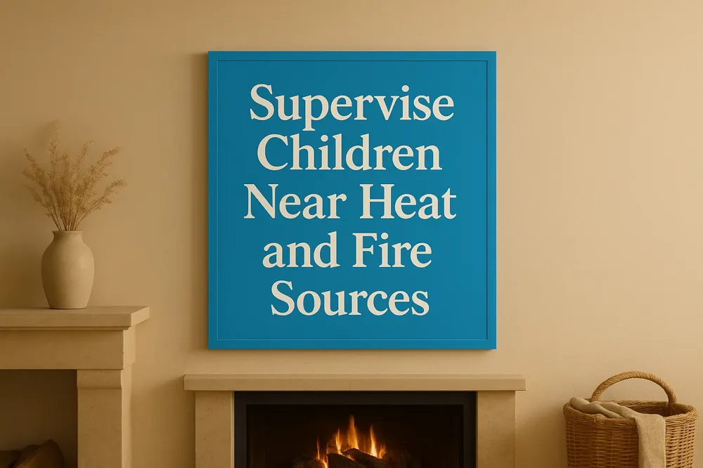 Always supervise children near fireplaces, wood-burning stoves, space heaters, and campfires. Maintain a safe distance of at least three feet between children and heat sources. Use fireplace screens or barriers to prevent contact burns and educate children about the dangers of fire and hot surfaces. For comprehensive advice see Fireplace and Heater Safety and Fire safety for kids.