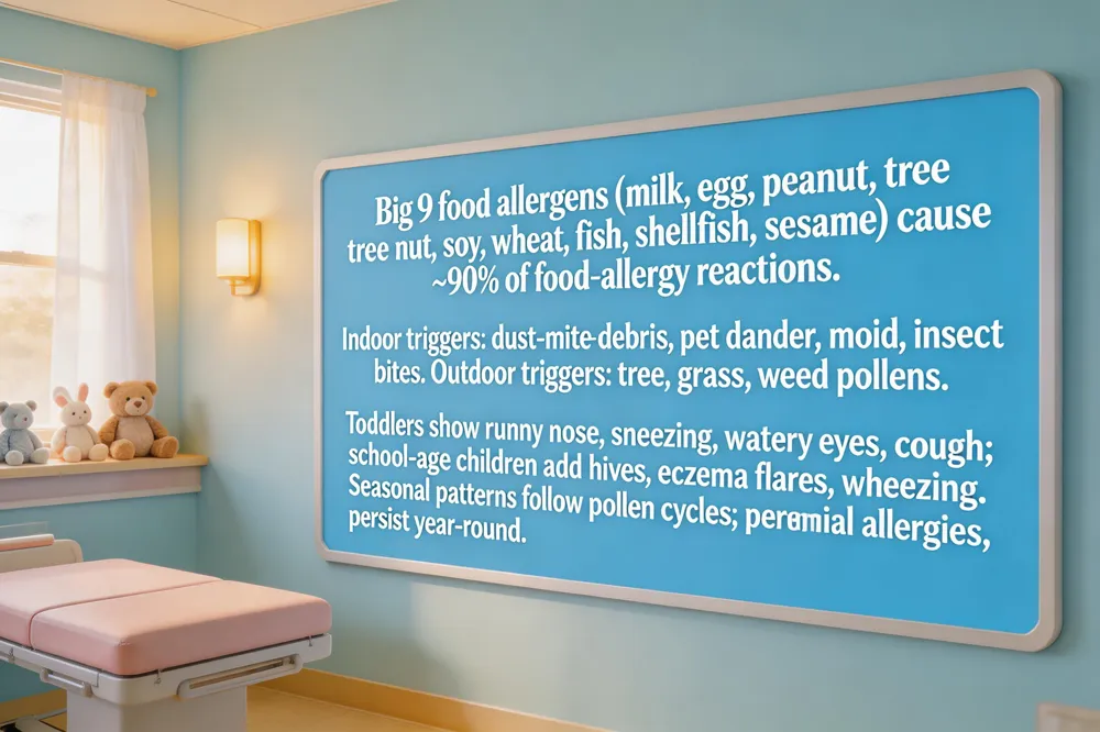 Children’s allergies most often involve the “Big 9” foods—milk, eggs, peanuts, tree nuts, soy, wheat, fish, shellfish and sesame—which account for about 90 % of food‑allergy reactions in the United States. Environmental triggers are equally common: indoor culprits include dust‑mite debris, pet dander, mold spores and insect bites or stings, while outdoor allergens are tree, grass and weed pollens. In toddlers, seasonal allergies typically appear as a clear, persistent runny nose or nasal congestion that recurs each year at the same time, accompanied by frequent sneezing, red watery eyes, eye rubbing and a cough or post‑nasal drip. Dark circles under the eyes and fatigue are also frequent, but fever is absent. School‑age children may show the same nasal and ocular symptoms, plus itchy hives or eczema flare‑ups and occasional wheezing that signals allergy‑triggered asthma. Allergic rhinitis (hay fever) follows a seasonal pattern—spring tree pollen, summer grass pollen, fall weed pollen—whereas perennial allergies from dust mites, mold, animal dander, indoor year‑round. Early identification, allergen avoidance, and a personalized plan created with a pediatric allergist are essential to keep children comfortable and reduce complications.