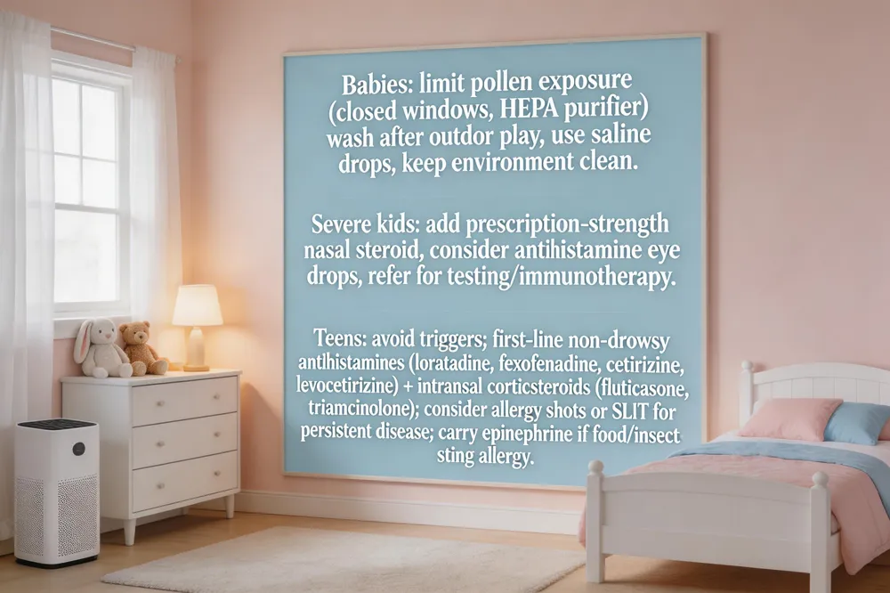 How to treat allergies in teens – Identify triggers and avoid them. First‑line therapy includes non‑drowsy oral antihistamines (loratadine, fexofenadine, cetirizine, levocetirizine) and intranasal corticosteroid sprays (fluticasone, triamcinolone). For persistent or severe cases, consider allergy immunotherapy (shots or SLIT). Teens with food or insect‑sting allergies must carry an epinephrine auto‑injector and know its use. Regular follow‑up with a pediatric or allergy specialist ensures optimal control and safety.