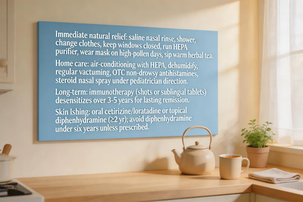 How to stop allergies immediately naturally – Rinse nasal passages with saline, shower, change clothes, keep windows closed, run HEPA purifier, wear mask on high‑pollen days, sip warm herbal tea.