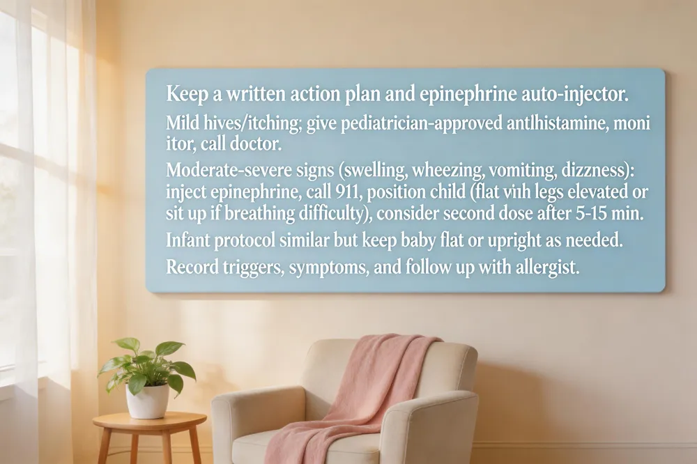 Baby allergic reaction treatment – For a single mild symptom, use the prescribed antihistamine, stay with the infant, and monitor. Severe signs (trouble breathing, lip/tongue swelling, vomiting) require immediate epinephrine, 911, and keeping the baby lying flat (or upright if breathing is compromised).