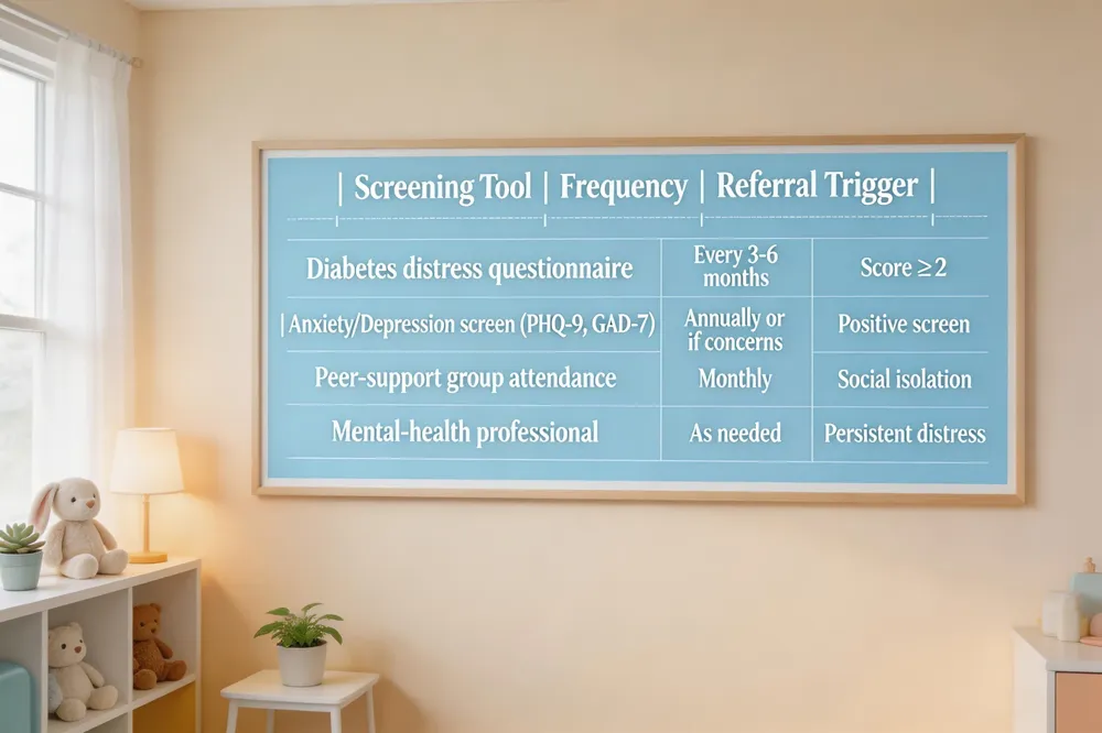Managing type 1 diabetes in children is not only about insulin and blood‑glucose numbers; mental‑health screening is a core part of care. The CDC and ADA stress routine checks for anxiety, depression, and diabetes distress, with referrals to counselors when symptoms appear. Support networks—such as the monthly group hosted by Kids & Teens Primary Healthcare and virtual JDRF “E‑Meet & Greet” sessions—offer peer connection and coping strategies that reduce isolation.
