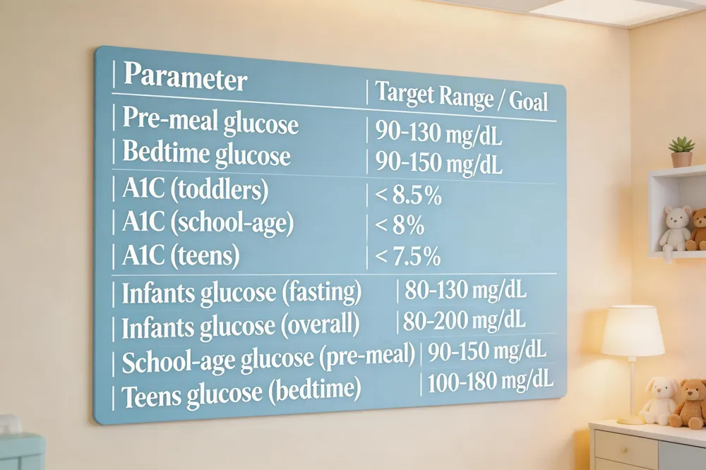 Blood‑sugar targets vary by age: infants 80‑200 mg/dL (fasting 80‑130), school‑age 70‑180 (pre‑meal 90‑150), teens 70‑150 (bedtime 100‑180). Values < 70 mg/dL are low; > 200 mg/dL are high.