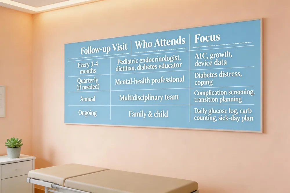 Treatment centers on lifelong insulin—multiple daily injections or pump—using rapid‑acting, basal, and, as needed. Regular glucose checks, carbohydrate‑aware meals, and daily activity guide dose adjustments. A multidisciplinary team (endocrinologist, diabetes educator, dietitian, mental‑health professional) provides education, sick‑day plans, and psychosocial support, while routine follow‑up visits ensure growth, glycemic control, and complication screening stay on track.