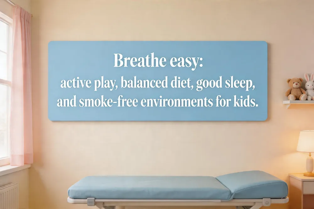 Encourage regular physical activity—walking, swimming, biking, or yoga—to strengthen lungs and heart while limiting sedentary screen time. Offer a balanced, anti‑inflammatory diet rich in fruits, vegetables, nuts, and omega‑3 sources, and cut processed foods and saturated fats that can irritate airways. Ensure age‑appropriate, restful sleep each night to support immune function and optimal breathing. Keep children away from second‑hand smoke and indoor pollutants; consider HEPA air purifiers and good ventilation. Schedule routine pediatric check‑ups to monitor lung health, adjust asthma or allergy meds, and catch problems early.