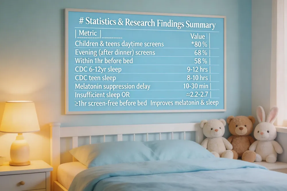 | In the United States, 80 % of children and teens use screens during the day, 68 % in the evening, and 58 % within an hour before bedtime (National Sleep Foundation, 2022). The CDC advises 9‑12 hours of sleep for 6‑12‑year‑olds and 8‑10 hours for teens, yet many fall short because of evening screen exposure. Blue‑light from phones, tablets, and TVs suppresses melatonin, delaying sleep onset by 10‑30 minutes and fragmenting deep‑sleep stages. Stimulating content—videos, games, social media—keeps the brain aroused, increasing sleep latency and daytime sleepiness. Systematic reviews show children who use portable devices at bedtime have over twice the odds of insufficient sleep (OR ≈ 2.2‑2.7). Reducing screen time at least one hour before bed improves melatonin levels and overall sleep quality. Persistent sleep problems should prompt a pediatric consultation, as they may indicate underlying health issues requiring professional evaluation. |