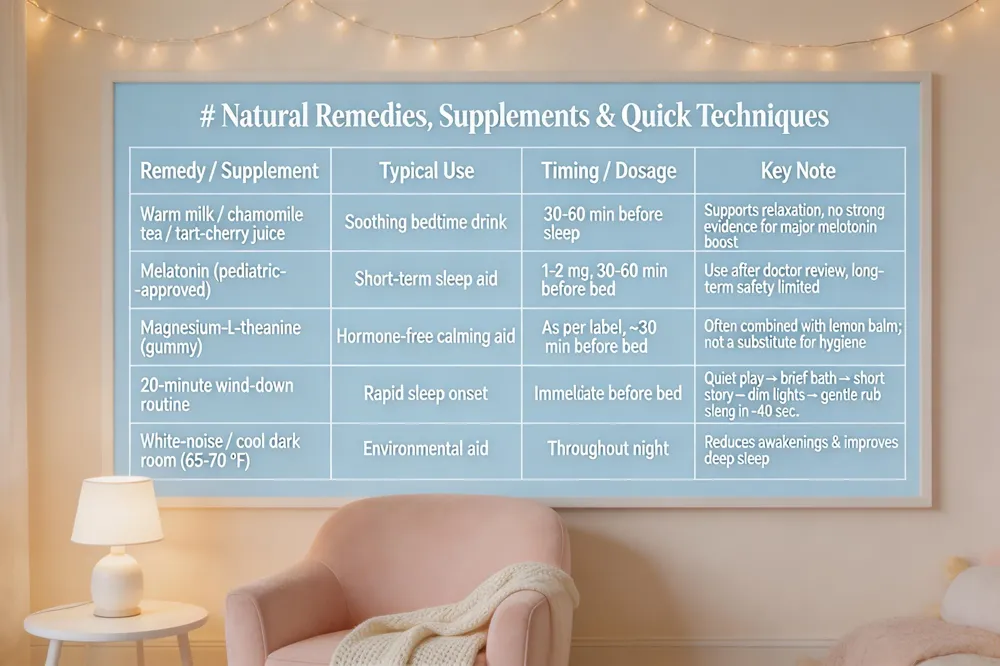For short‑term assistance, pediatric‑approved melatonin (1‑2 mg) taken 30‑60 minutes before bed may help, but only after a doctor’s review because long‑term safety data are limited. Parents preferring hormone‑free options can try magnesium‑L‑theanine blends, such as gummies that also contain lemon balm, while remembering that supplements never replace solid sleep hygiene.