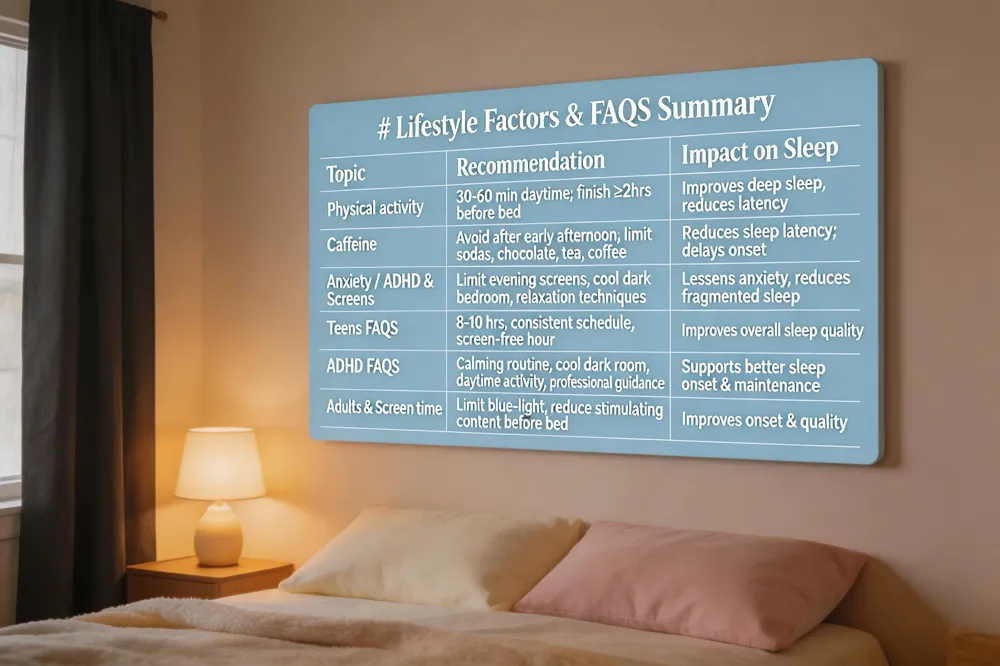 | Physical activity and caffeine: Regular daytime exercise (30‑60 min) promotes deeper sleep, but vigorous activity should finish at least two hours before bedtime. Caffeine—found in sodas, chocolate, tea, or coffee—should be avoided after the early afternoon; even a single cup can lengthen sleep latency in teens. |