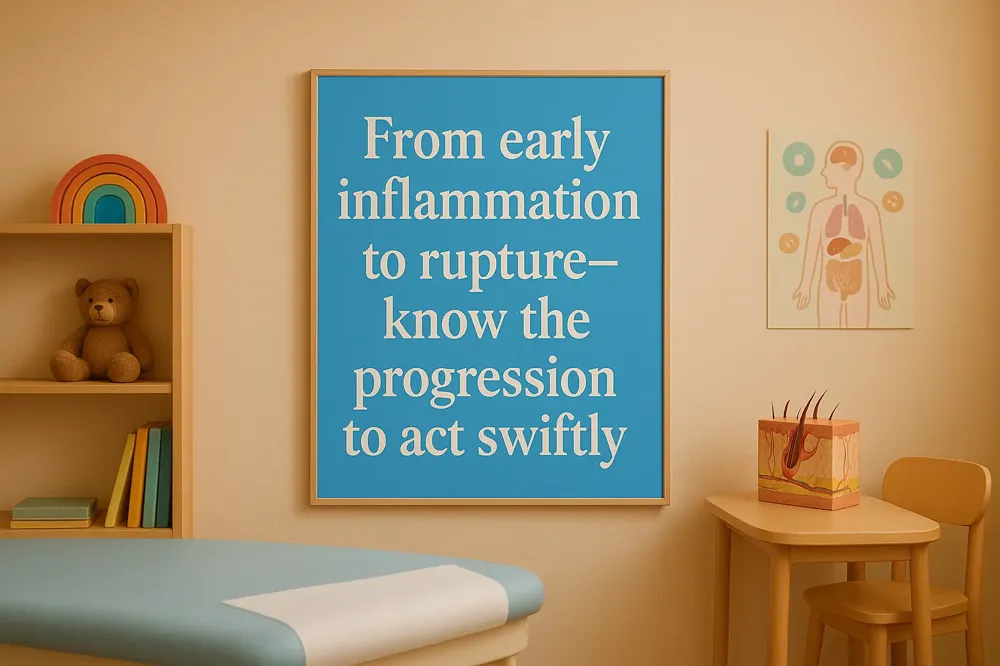 In toddlers and younger children, appendicitis symptoms may be less obvious. These children often present with persistent abdominal pain, again typically starting near the belly button and then localizing to the lower right abdomen. They may also show a mild to moderate fever, irritability, increased fussiness, nausea, vomiting, and a decrease in appetite. Young children may not be able to properly describe their pain, so signs like a swollen belly or tenderness in the lower abdomen when touched or during movement should raise concern. Behavioral changes or signs of general illness always warrant evaluation by a healthcare professional. Early diagnosis is crucial to reduce the risk of rupture and complications.