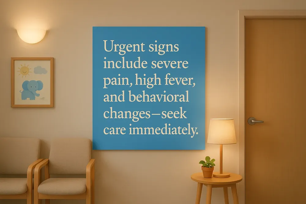 Persistent and worsening abdominal pain is the hallmark of appendicitis in children, particularly if it starts near the belly button and migrates to the lower right abdomen. Signs such as a high fever (possibly reaching 104°F or 40°C), persistent nausea or vomiting, inability to eat, and abdominal swelling demand urgent care. Pain that intensifies with movement, coughing, or walking is especially concerning. Children may resist jumping or moving to prevent pain. Behavioral changes like irritability or loss of appetite are additional red flags, particularly in younger children. Immediate medical evaluation is critical to avoid dangerous complications such as rupture, peritonitis, or sepsis (Medical emergency for appendicitis, Appendicitis medical emergency).