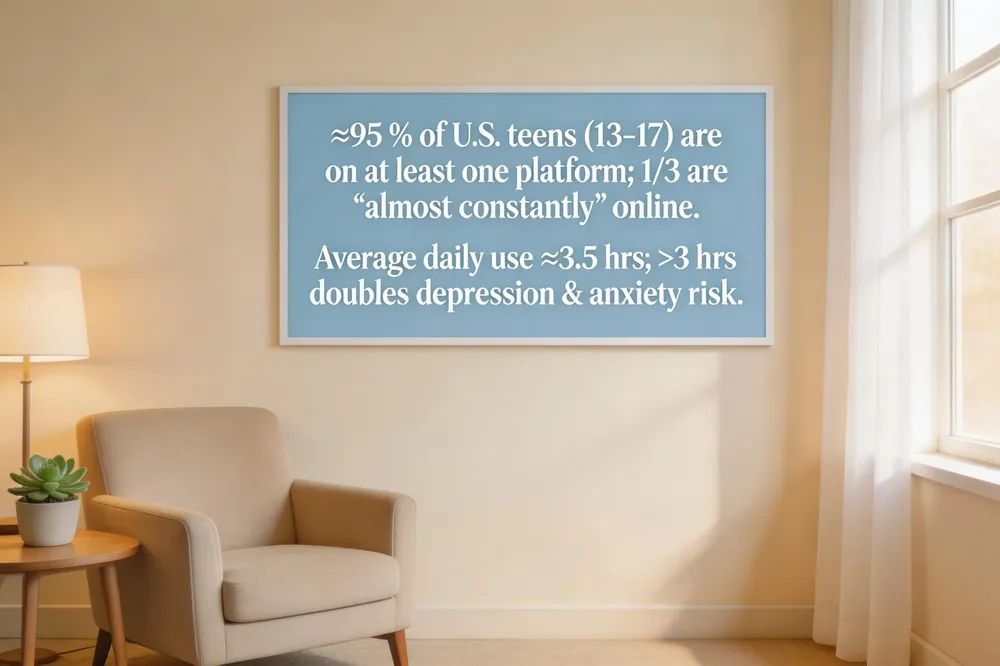 Today, almost every American teenager—about 95 % of 13‑ to 17‑year‑olds—spends several hours a day on platforms such as TikTok, Instagram, Snapchat and YouTube. This near‑ubiquitous presence means social media shapes how teens learn, socialize and see themselves. While 58 % report feeling more accepted and 80 % say it keeps them connected, research consistently links more than three hours of daily use with twice the risk of depression, anxiety and sleep problems, especially for girls and those already struggling with mental health. Algorithms that amplify harmful content, cyber‑bullying and exposure to unrealistic body ideals can further erode wellbeing. Parents are the first line of defense: setting clear screen‑time limits, creating device‑free zones, modeling balanced habits and maintaining open, non‑judgmental conversations about online experiences. When warning signs—persistent low mood, irritability, insomnia or changes in school performance—appear, seeking professional evaluation promptly can prevent escalation and protect a teen’s future health.