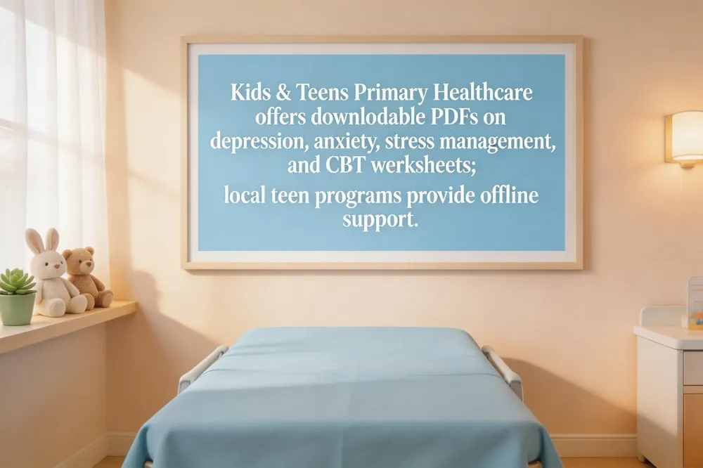 Kids & Teens Primary Healthcare offers printable mental‑health handouts for adolescents covering depression, anxiety, stress management, and signs of bipolar disorder. These evidence‑based PDFs, sourced from the National Institute of Mental Health, feature clear graphics and a share‑ready text for social‑media use. Families can download them from the clinic website or request a hard copy during a well‑child visit. In addition, free CBT worksheets from Therapist Aid—such as “Facing Fears With Whiskers” and “Productive Worrying”—are available to teach coping skills. All materials are age‑appropriate, culturally sensitive, and aligned with U.S. preventive‑service guidelines.