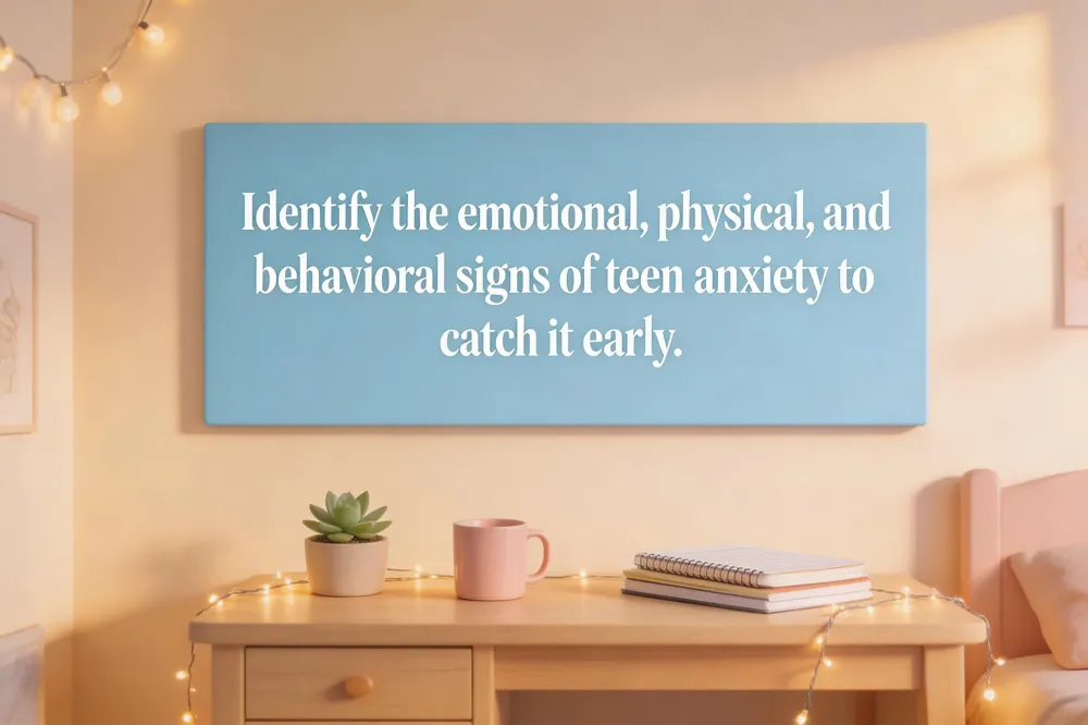 Teen anxiety often shows up as excessive worries or fears that feel out of proportion, even when there’s no clear threat. Emotionally, teens may seem constantly restless, on edge, or overly self‑conscious, and they may experience irritability, perfectionism, or social withdrawal. Physical manifestations include frequent stomachaches, headaches, muscle tension, rapid heartbeat, sleep problems, and sudden fatigue—symptoms that often have no medical cause. Behaviourally, you might notice avoidance of school or social activities, repeated reassurance‑seeking, declining grades, or substance use as a coping strategy.