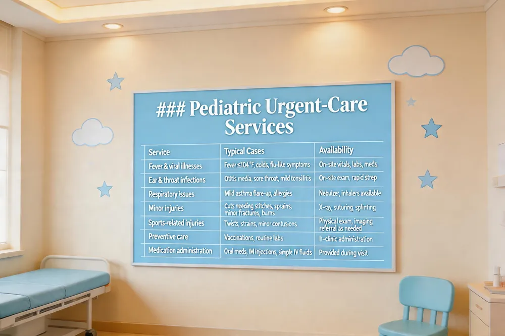 Pediatric urgent care treats non‑life‑threatening illnesses and minor injuries—fevers, colds, flu‑like symptoms, ear/throat infections, mild asthma or allergies, cuts needing stitches, sprains, minor fractures, bruises, burns, and sports‑related injuries. On‑site X‑rays, labs, vaccinations and medications are usually available.