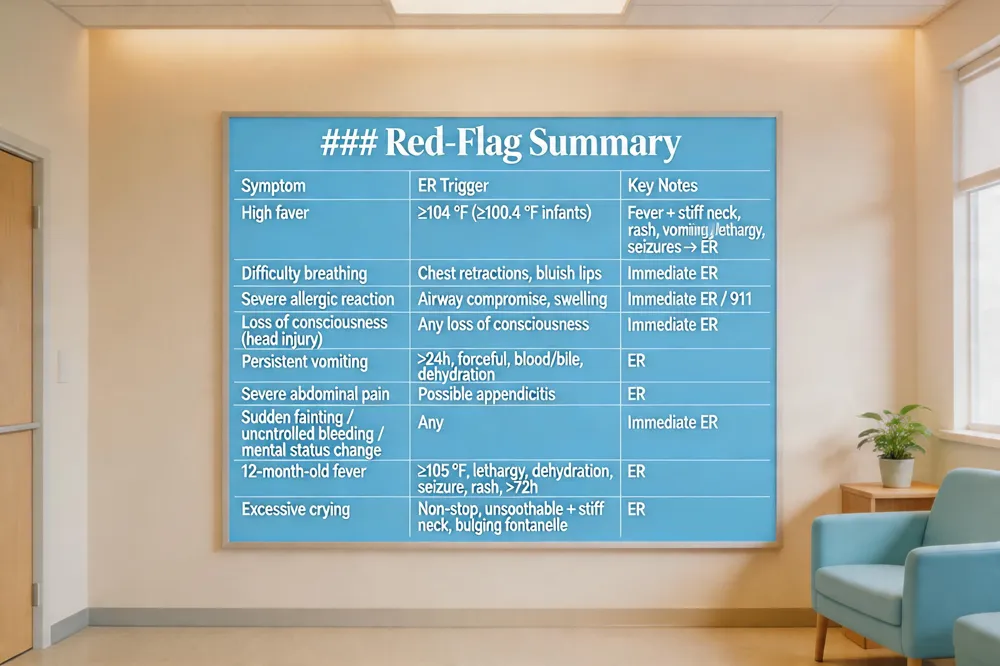 Emergency room criteria: Call 911 or go straight to the ER when a child is choking, not breathing, has bluish lips, severe allergic reaction with airway compromise, uncontrolled bleeding, loss of consciousness after head trauma, seizure lasting >5 minutes, or any injury that could cause permanent disability. High‑fever red flags include infants <1 month with 100.4 °F (38 °C) or higher, fever >105 °F (40.5 °C) at any age, or fever with stiff neck, rash, vomiting, lethargy, or seizures.
