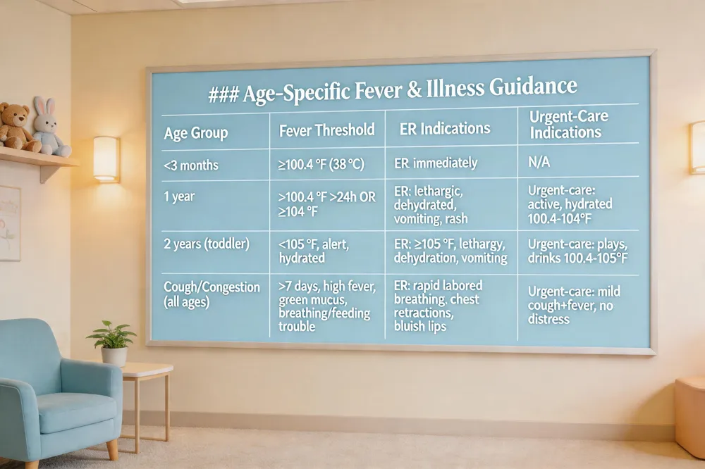 | Age Group | Fever Threshold | ER Indications | Urgent‑Care Indications |