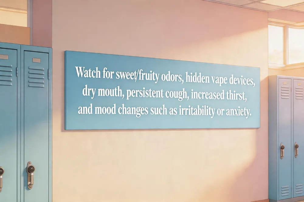 Five practical signs to watch for are: (1) the lingering sweet odor; (2) hidden vape‑like devices or pods; (3) a new or worsening dry cough, sore throat, or nosebleeds; (4) increased thirst and constant sipping of water; and (5) mood shifts such as irritability, anxiety, or sudden breaks to “freshen up.”