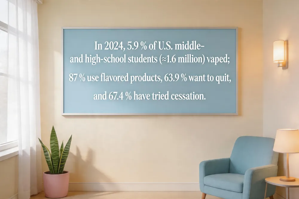 Vaping facts for teens – In 2024, about 5.9 % of U.S. middle‑ and high‑school students (≈1.6 million) reported current e‑cigarette use, and 87 % prefer flavored products that mask nicotine’s strength. Vaping can impair brain development, cause anxiety, sleep problems, chronic bronchitis, and raise the odds of later cigarette smoking. A majority of teen vapers want to quit (63.9 %) and many have tried (67 %).