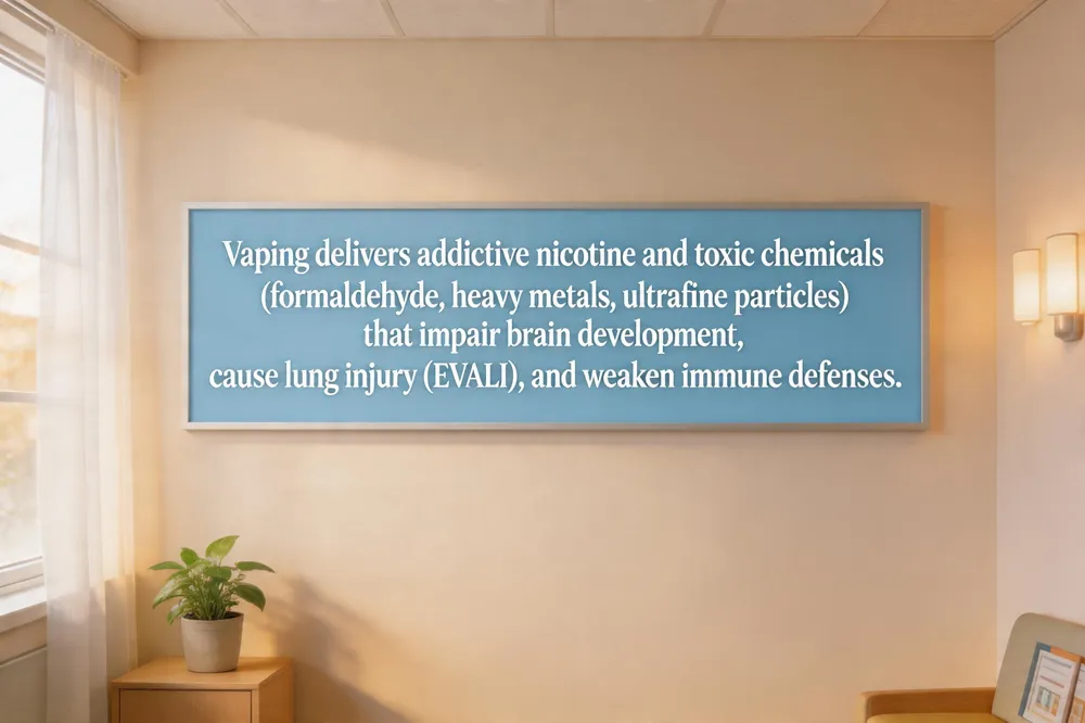 Vaping exposes teens to nicotine, a highly addictive toxin that nicotine exposure during adolescence can impair brain development up to age 25, affecting concentration, decision‑making, and emotional regulation and impairs memory, concentration, learning, and impulse control. Even occasional use can create cravings, irritability, and withdrawal symptoms, making quitting difficult. The aerosol inhaled from e‑cigarettes contains toxic chemicals such as formaldehyde, acrolein, heavy metals such as nickel, chromium, and lead, ultrafine particles, and flavoring agents like diacetyl that irritate the lungs, throat, and eyes. These substances can trigger bronchitis, asthma exacerbations, and chronic cough, and they weaken immune defenses, increasing susceptibility to infections.