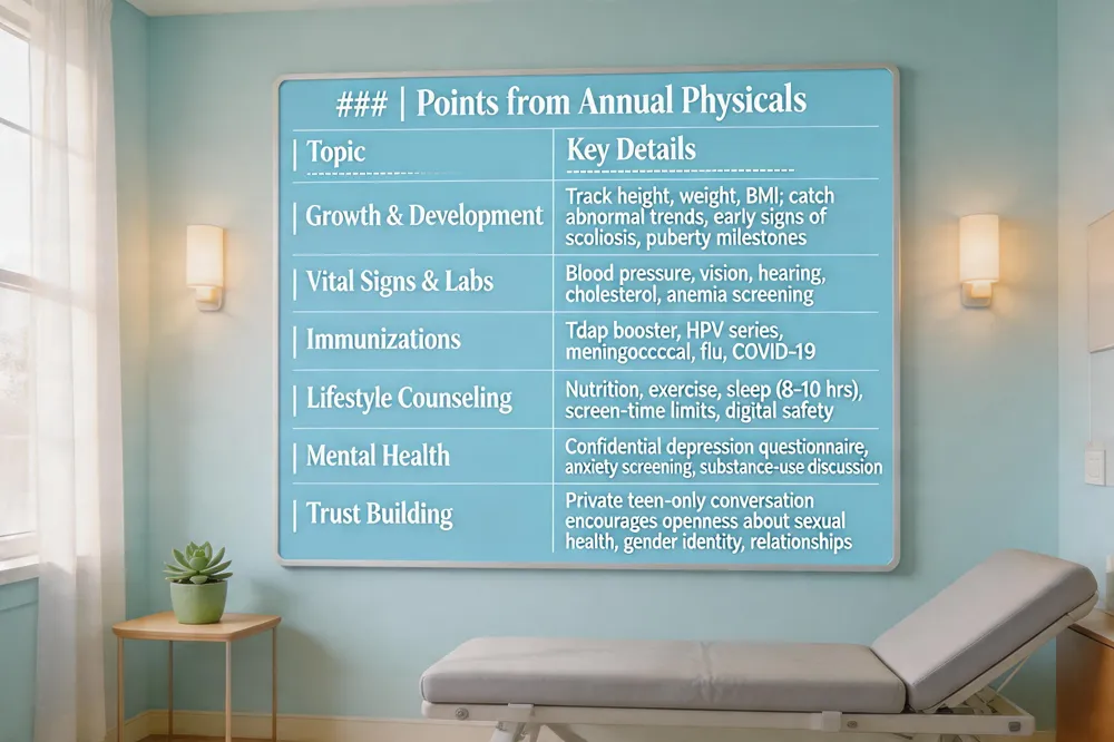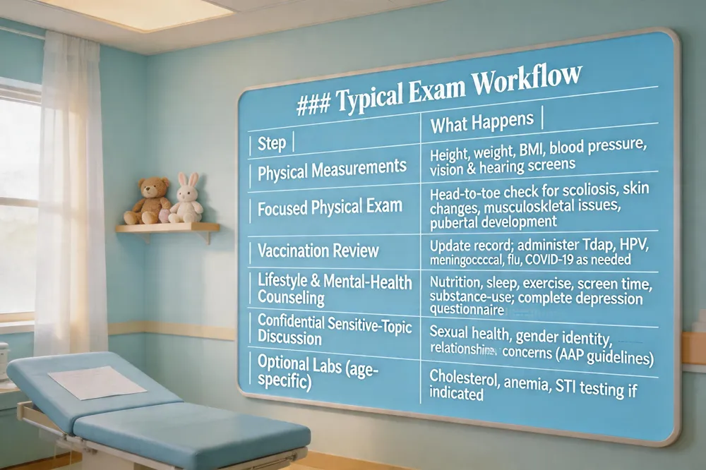 During a teen wellness exam the clinician begins with physical measurements and screenings: height, weight, BMI, blood pressure, vision and hearing checks, and a brief head‑to‑toe exam that looks for scoliosis, skin changes, musculoskeletal issues, and pubertal development. Vaccination review and administration follows; the provider updates the record and gives any due shots such as the Tdap booster, HPV series, meningococcal vaccine, seasonal flu shot, or COVID‑19 booster. The visit then moves to lifestyle counseling and mental‑health assessment, where the teen discusses nutrition, sleep (8‑10 hours), exercise, screen time, and substance‑use habits while completing a confidential depression questionnaire. Finally, a confidential discussion of sensitive topics allows the teen to ask about sexual health, gender identity, relationships, or any other “hot topics” without parents present, in line with AAP guidelines.
