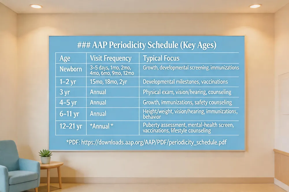 - AAP well‑child visit schedule: See the PDF for the full list; it starts with newborn visits and shifts to annual exams after age 3.