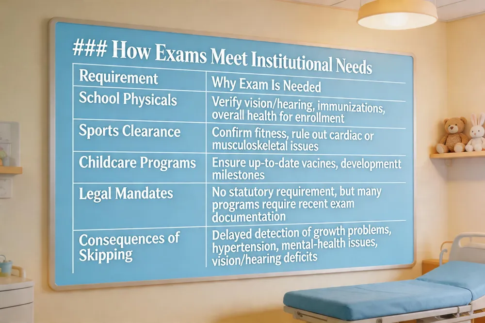 Because these requirements are tied to school and program policies, families frequently need a recent exam to meet eligibility criteria, even though the visit itself isn’t a statutory obligation. Skipping the annual wellness exam can postpone detection of growth abnormalities, vision or hearing problems, hypertension, early mental‑health concerns, or other chronic conditions—making later treatment harder and less effective.
